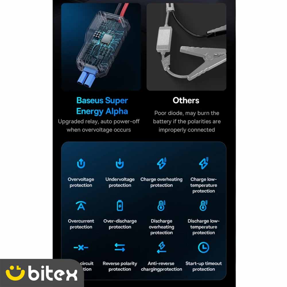 بیسوس در سری آلفا از جدیدترین پروتکلهای ایمنی برای تضمین سلامت خودرو و کاربر استفاده کرده است. جامپ استارتر بیسوس مدل BS-CH006 به لایههای حفاظتی متعددی مجهز است که از بروز حوادث زیر جلوگیری میکند: