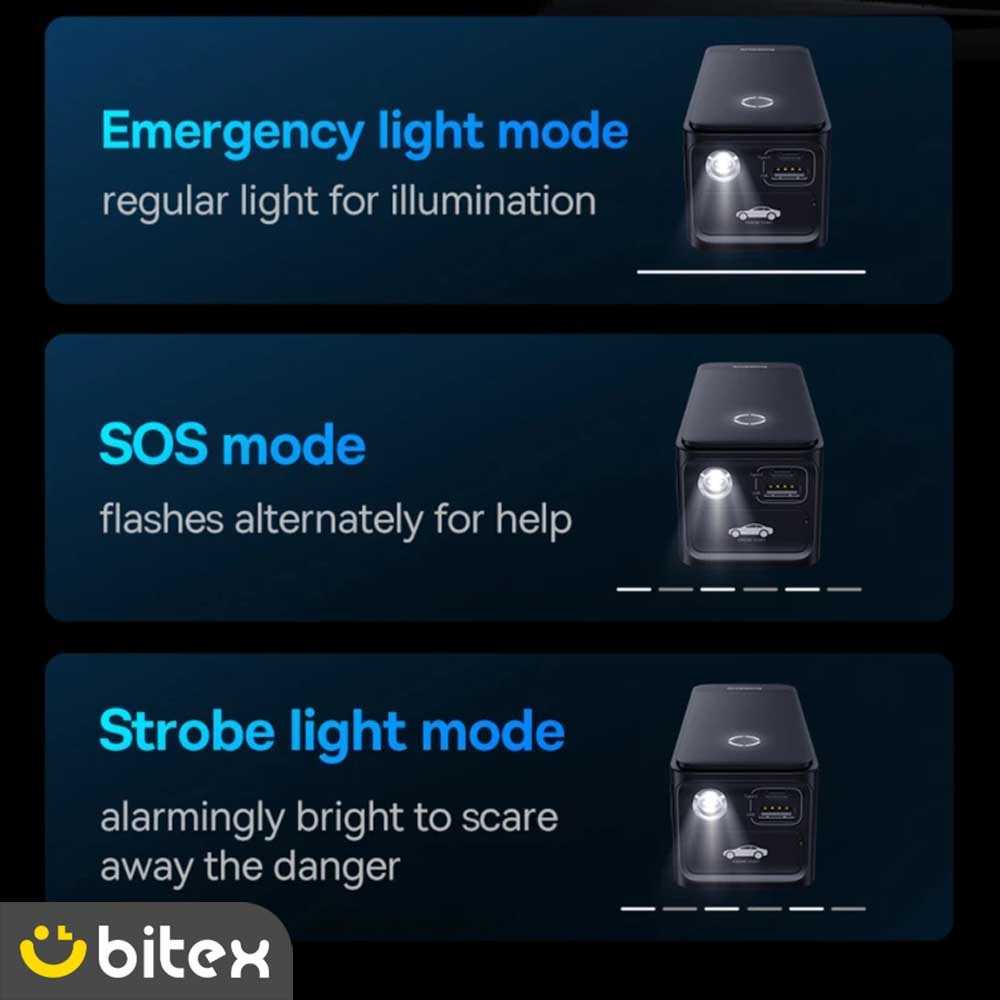یکی از ویژگیهای حیاتی جامپ استارتر بیسوس مدل BS-CH006، چراغ LED چندمنظوره آن است که دارای سه حالت نوری مجزا برای شرایط مختلف میباشد: