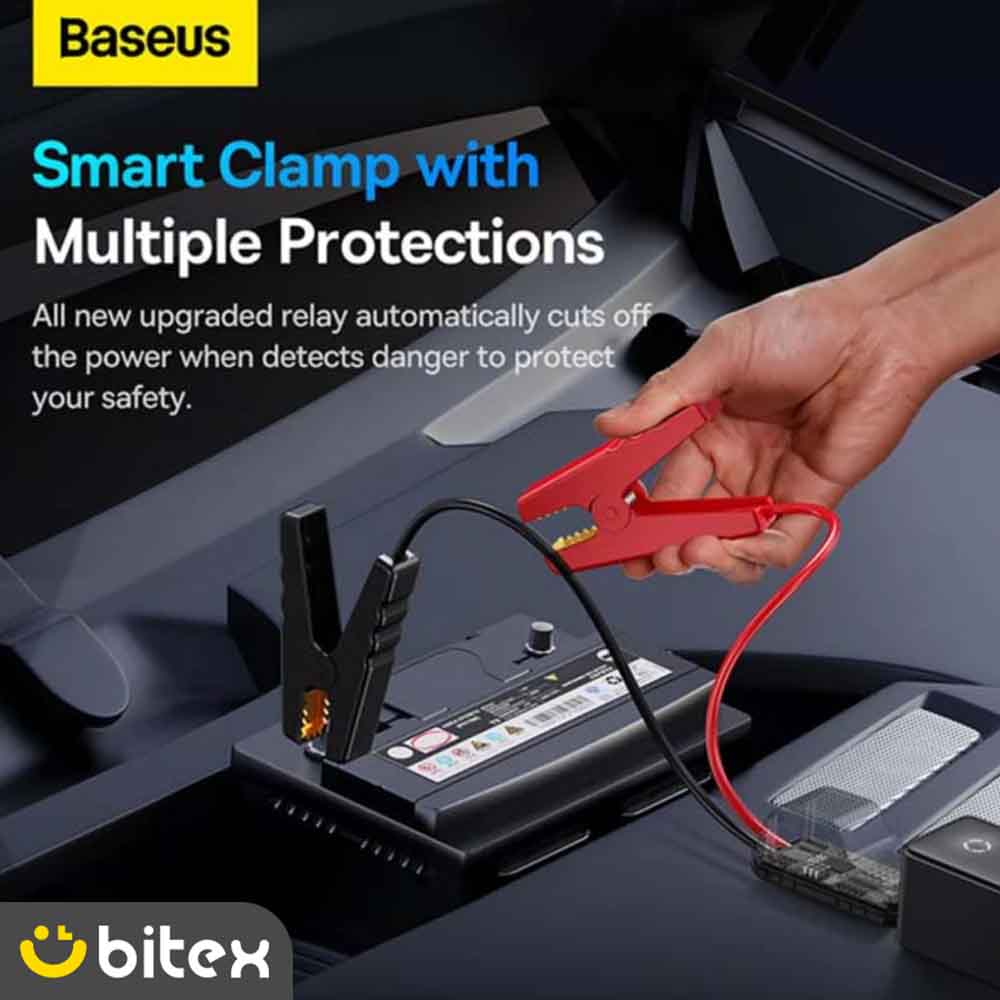 انبرهای (گیرهها) متصل به جامپ استارتر بیسوس مدل BS-CH006 از مس با خلوص بالا ساخته شدهاند که علاوه بر رسانایی فوقالعاده برای انتقال جریان ۶۰۰ آمپری، در برابر شکستگی و فشار نیز بسیار مقاوم هستند. استفاده از این سیستم هوشمند (Smart Clamps) باعث میشود حتی افرادی که دانش فنی ندارند، بدون ترس از آسیب زدن به ایسییو (ECU) یا سیستم برق خودرو، از دستگاه استفاده کنند.