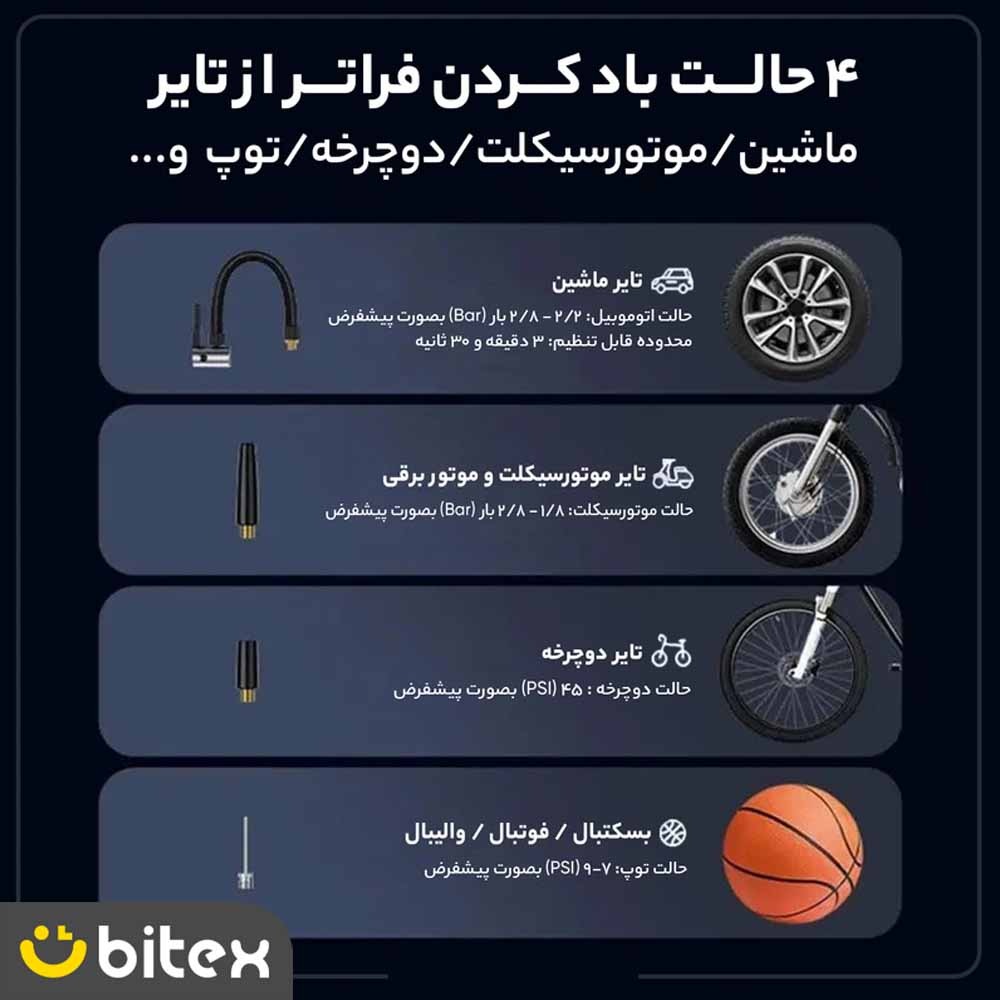- سرعت شارژ: باد کردن کامل تایر تنها در ۳.۵ دقیقه.