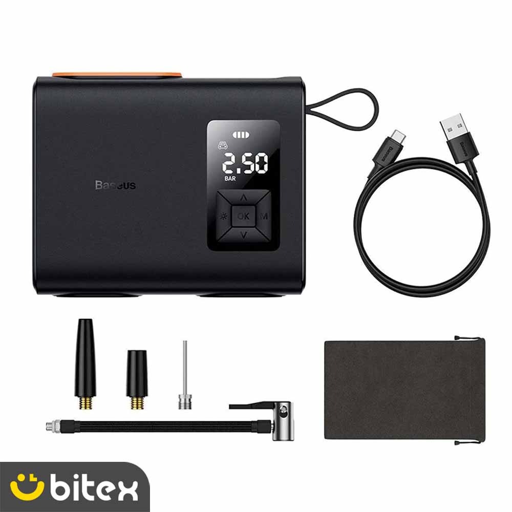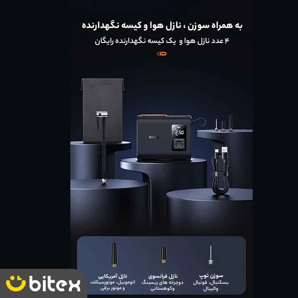 | اقلام همراه | ۳ عدد نازل (نازل خودرو/دوچرخه، سوزن توپ، نازل موتورسیکلت ورزشی), دفترچه راهنما, شلنگ باد فشار قوی, کابل شارژ Type-C, کیسه پارچهای مخصوص حمل و نگهداری |