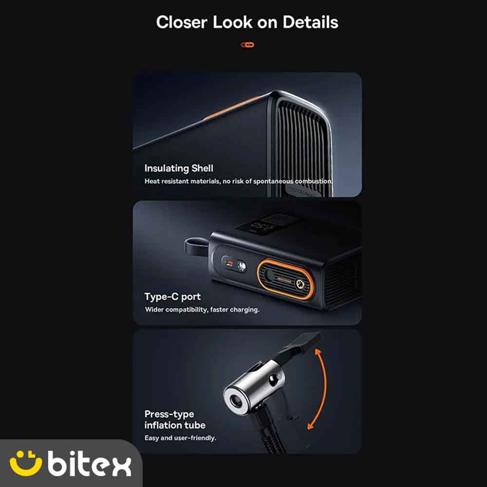 | قابلیت ها | تشخیص فشار باد لاستیک به طور خودکار به محض اتصال, چراغ قوه LED سهحالته (نور ثابت، SOS، بارق/چشمکزن), سیستم دفع حرارت پیشرفته با ۵۴۸ حفره تهویه, قطعکن خودکار, نمایشگر دیجیتال LCD برای پایش باتری و فشار |